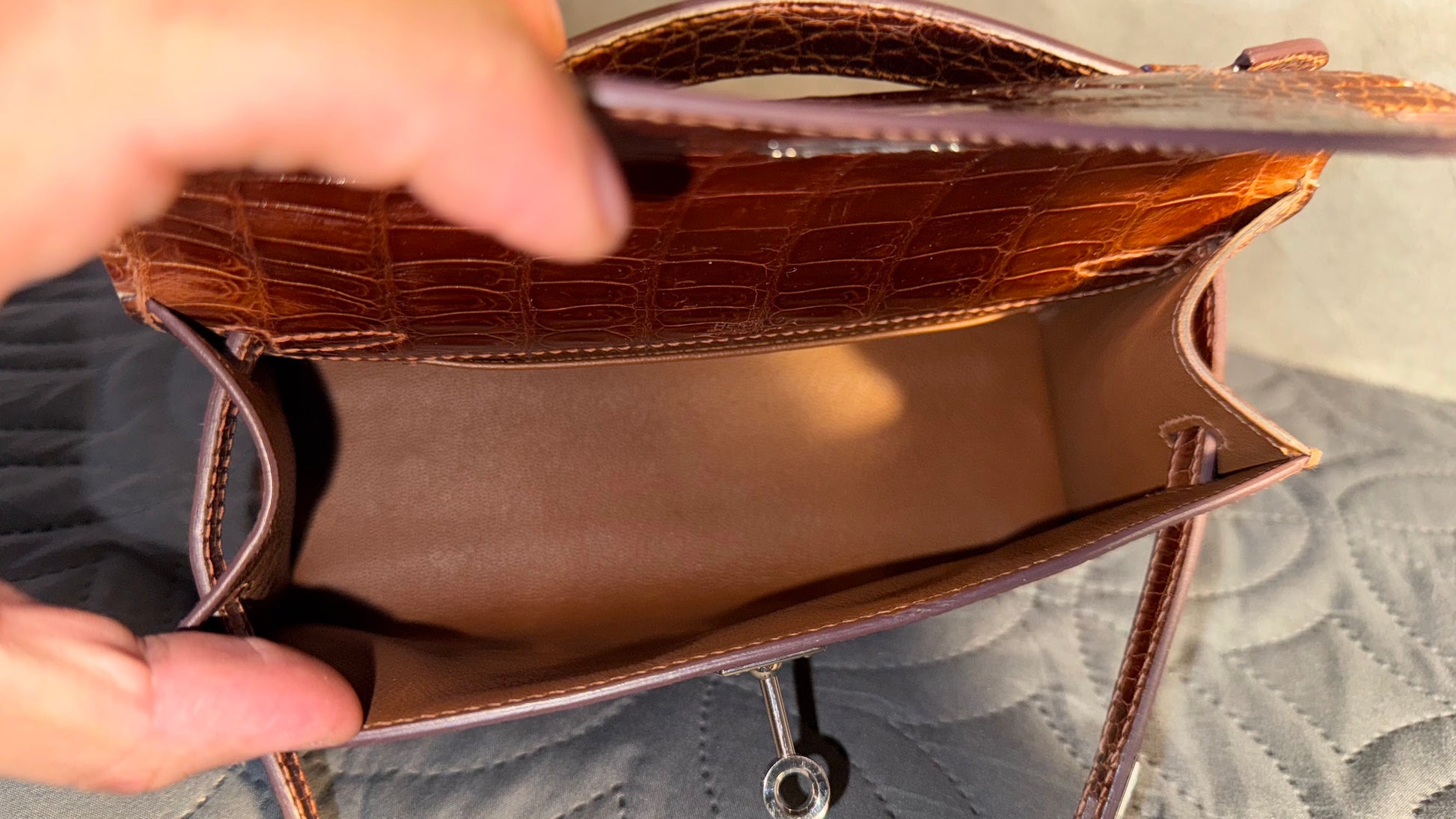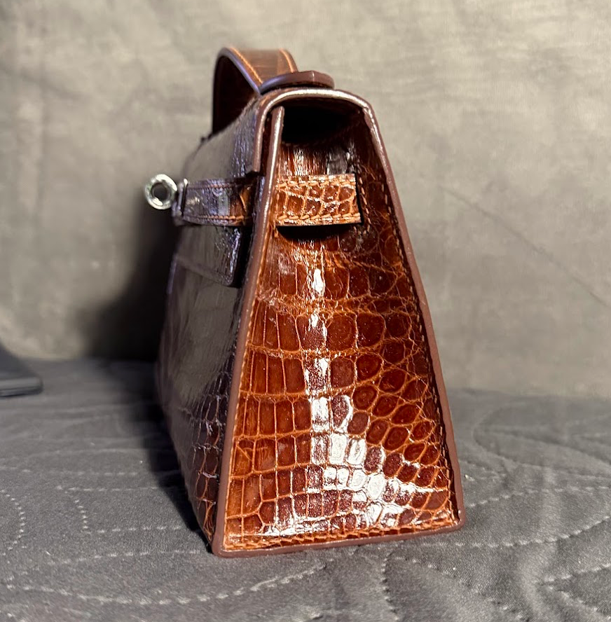Kelly Pochette in shiny alligator, drenched in the warm honey tones of Miel. A timeless mini with palladium hardware, sleek lines, and ultimate sophistication in the palm of your hand. 🐊🍯